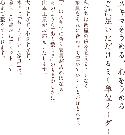 限られた間取りの中で、どう家具を置くか悩むのは、賃貸暮らしのあるある。「あと数センチ小さければ……」そのような声に応える家具を、ミリ単位でお作りいたします。