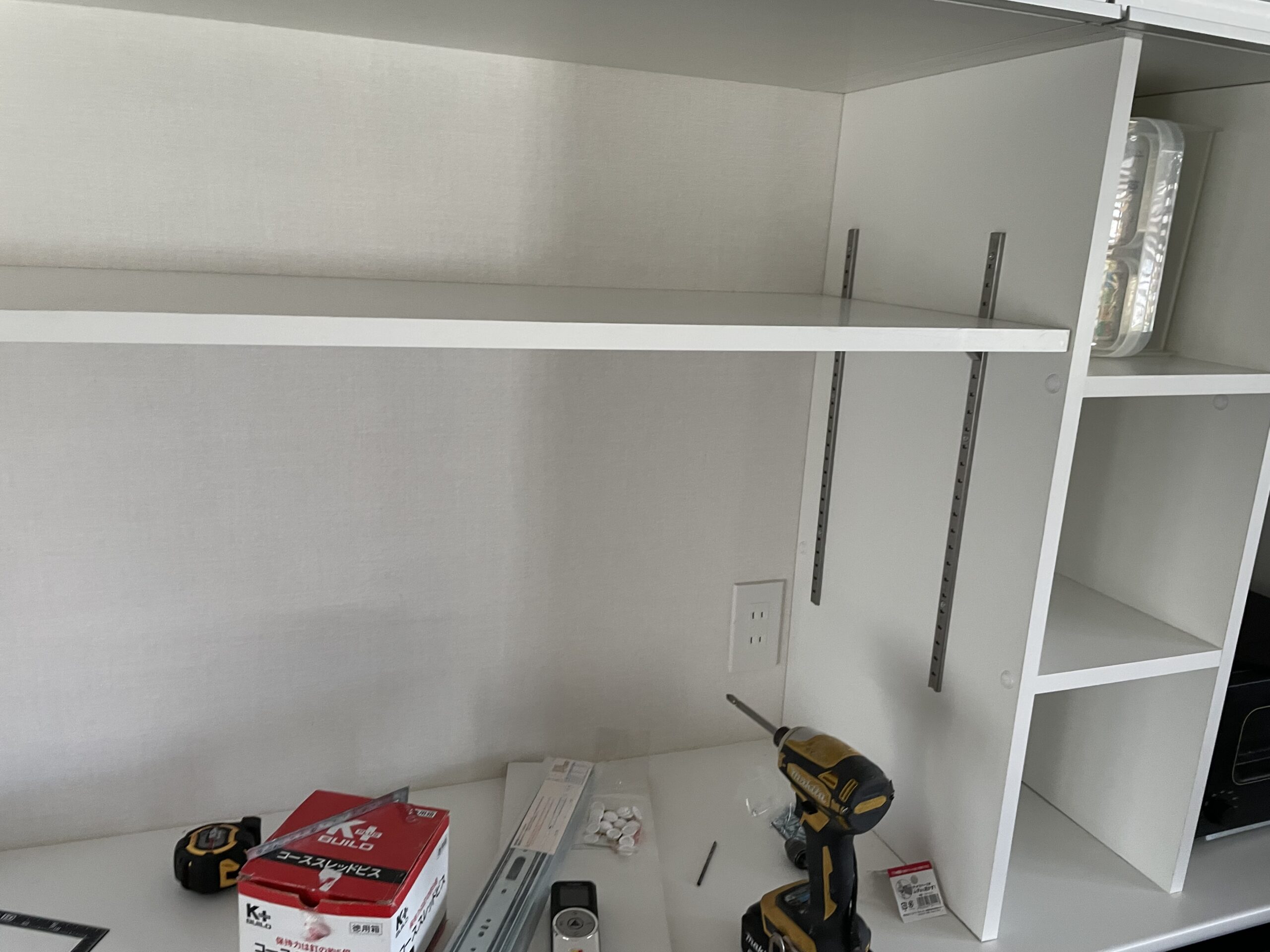既存の収納ボックスに合わせ棚を制作し、可動棚も追加‼️収納が増え、家電もいっぱい置けるようになり、喜んでいただきました☺️☺️